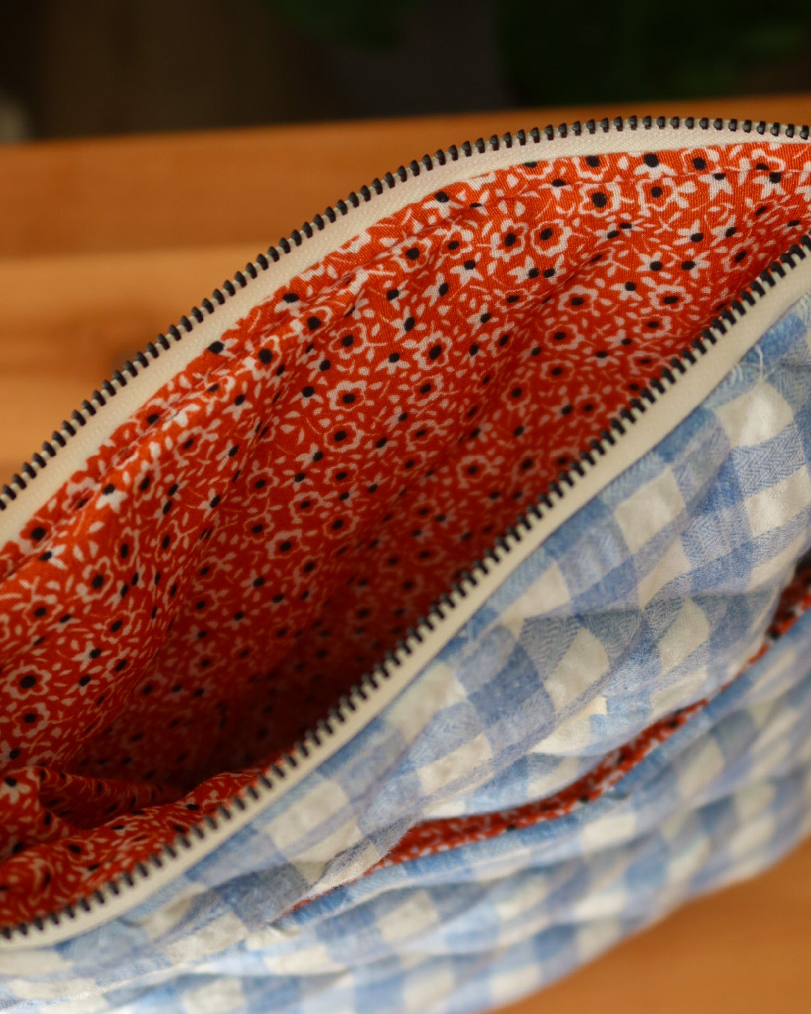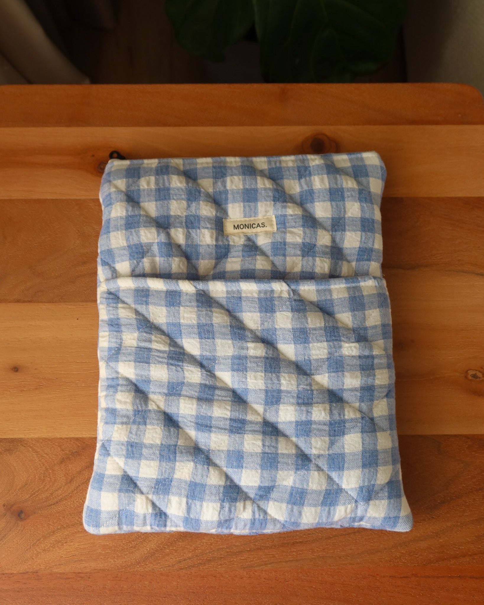 Quilted cotton sleeve with zipper and pocket. Fully lined with repurposed luxury cotton fabric.