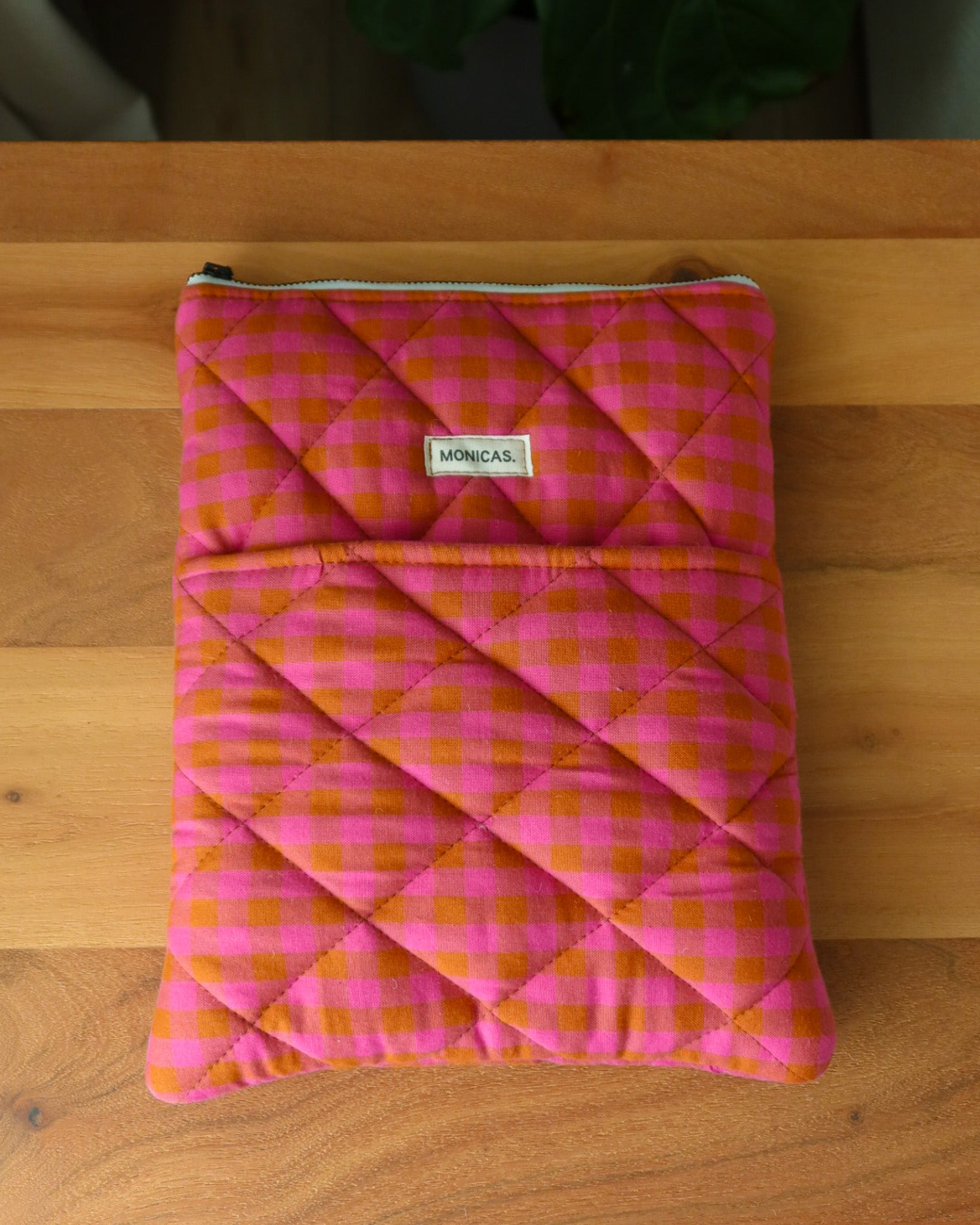 Quilted cotton sleeve with zipper and pocket. Fully lined with repurposed luxury cotton fabric.