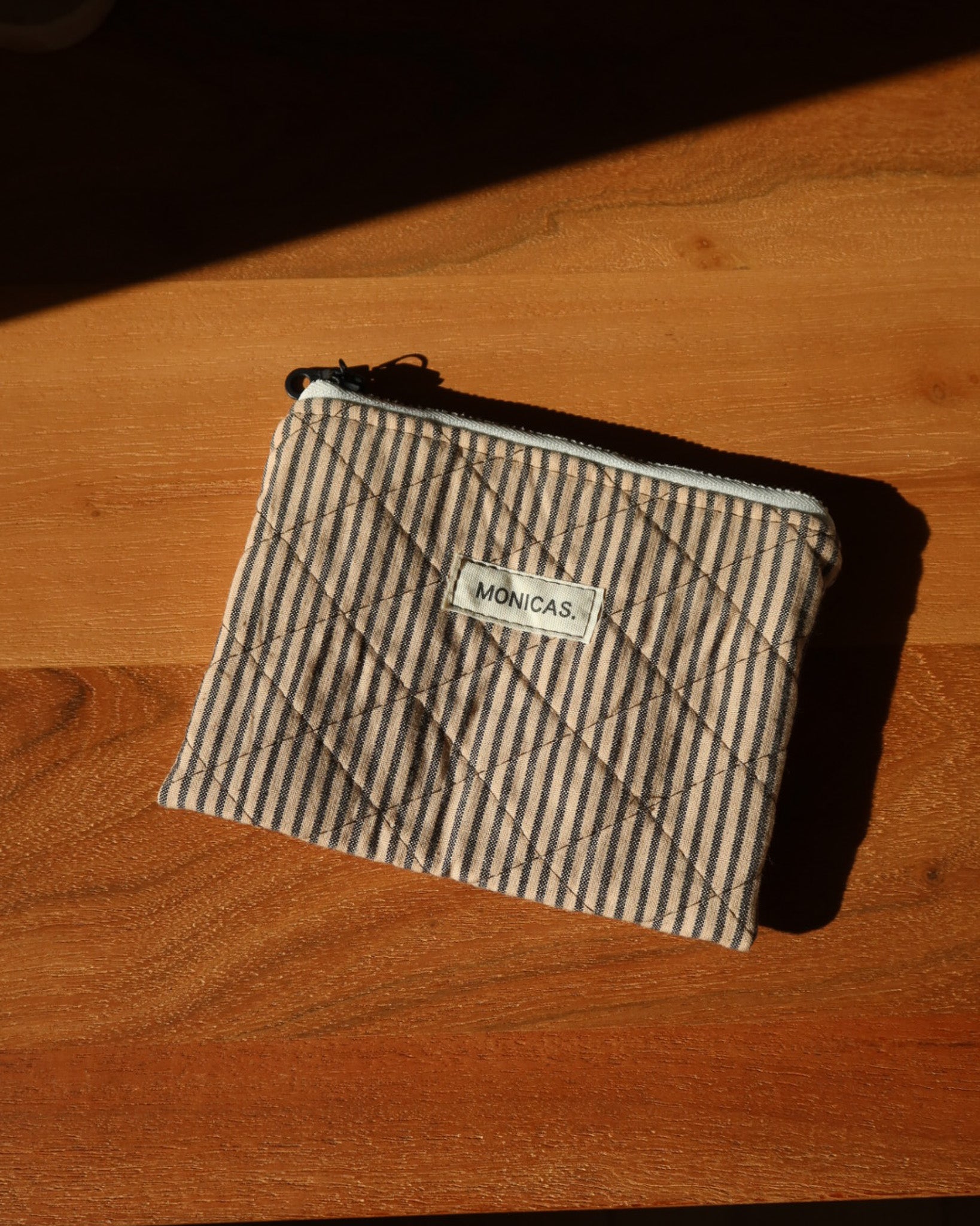Quilted cotton pouch with zipper. Fully lined with repurposed luxury cotton fabric.