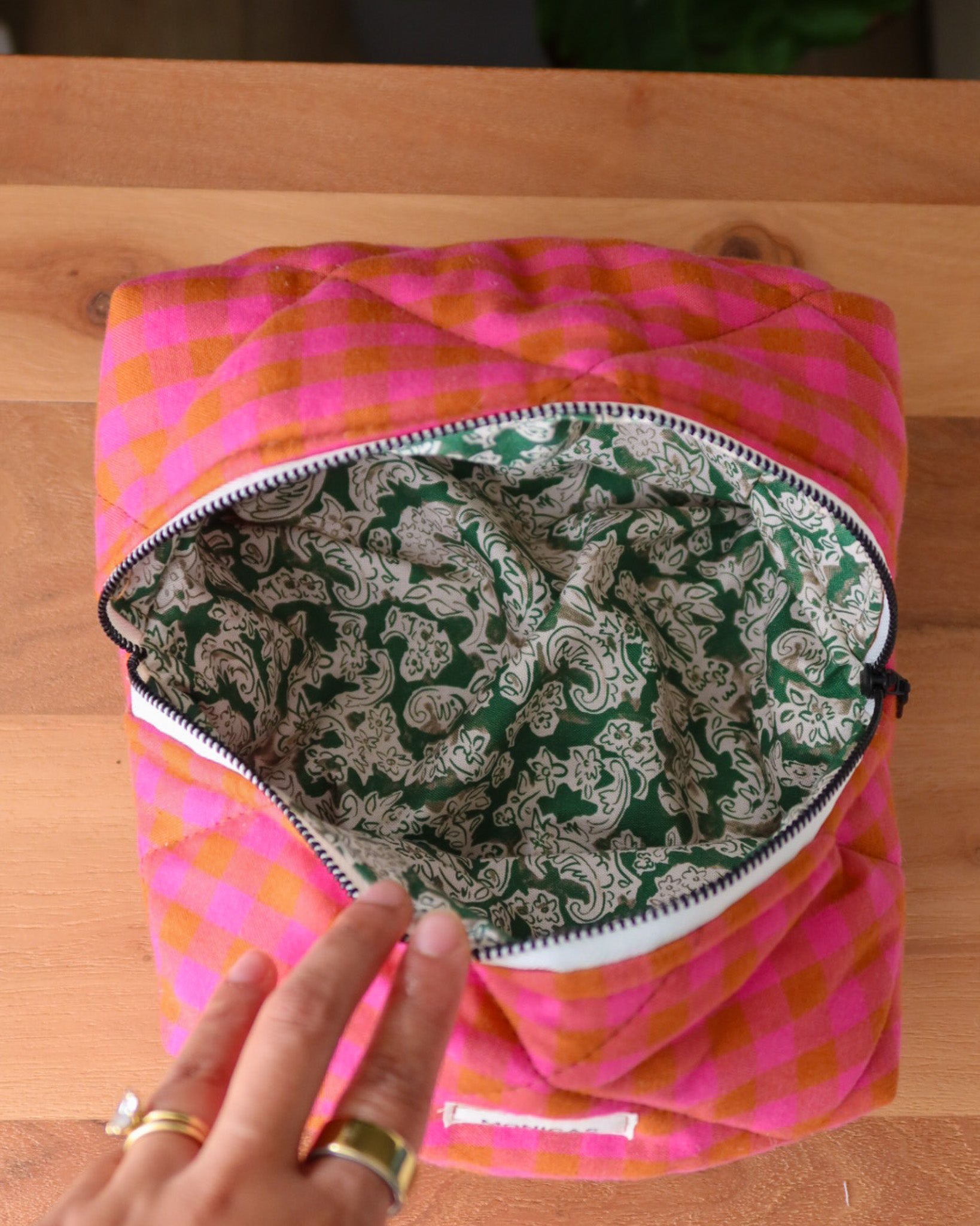 Quilted linen pouch with zipper. Fully lined with repurposed luxury cotton fabric.