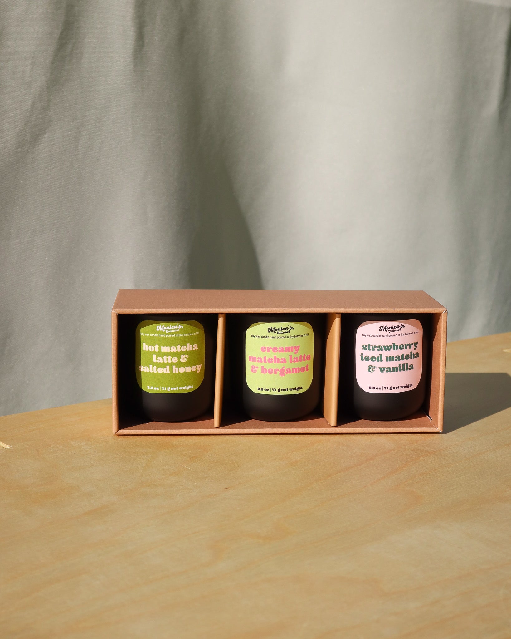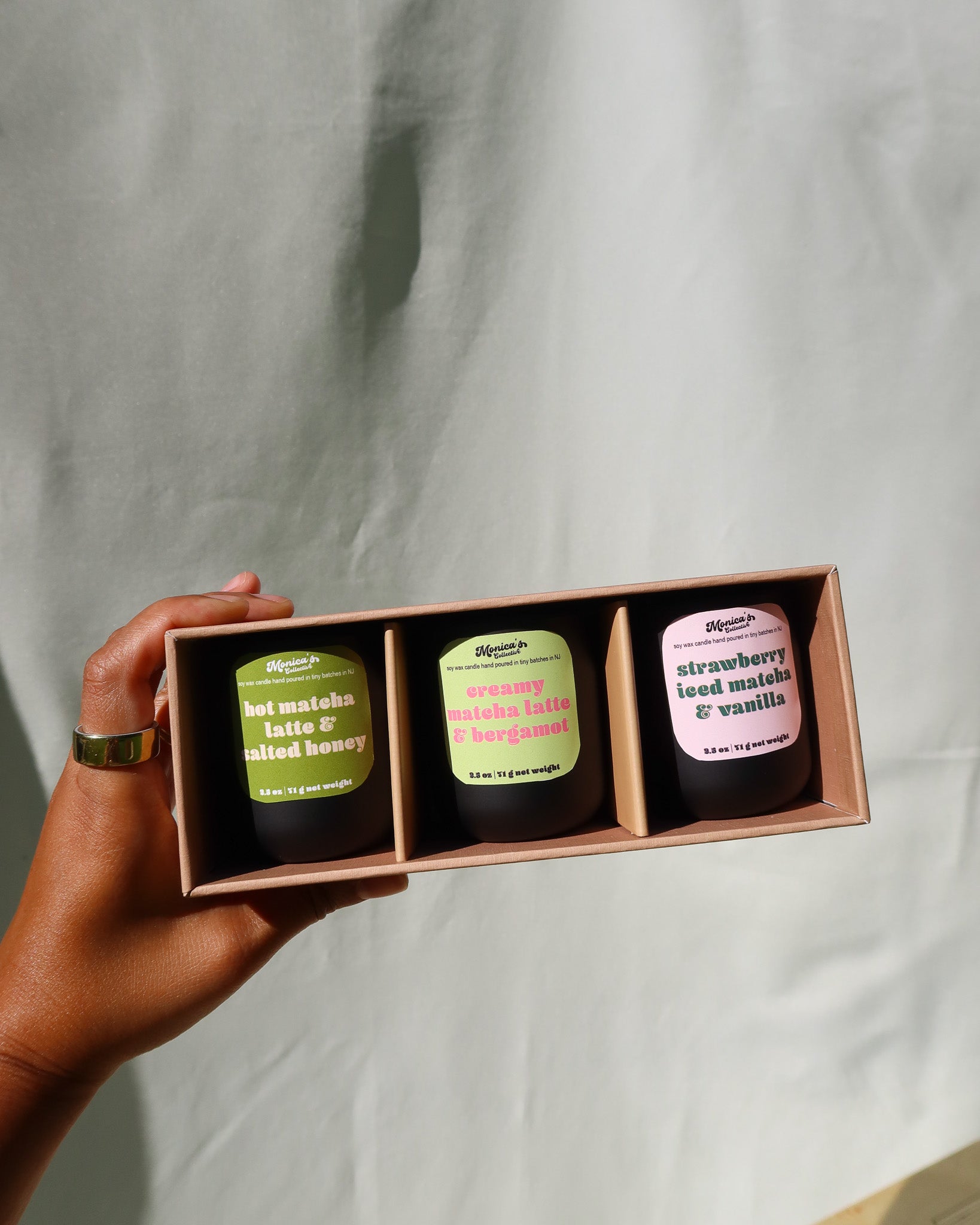 POV: you can't get enough of matcha 🍵, so we created 3 matcha-themed candles just for you. Candle flights are packaged up in a luxurious natural gift box.